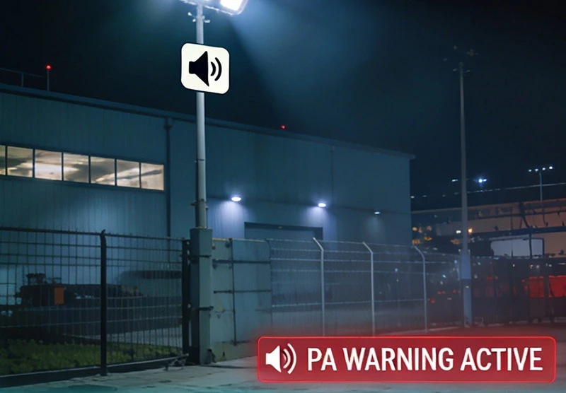 Triggering localized site lighting and automated voice warnings via PA systems when unauthorized presence is detected at night.